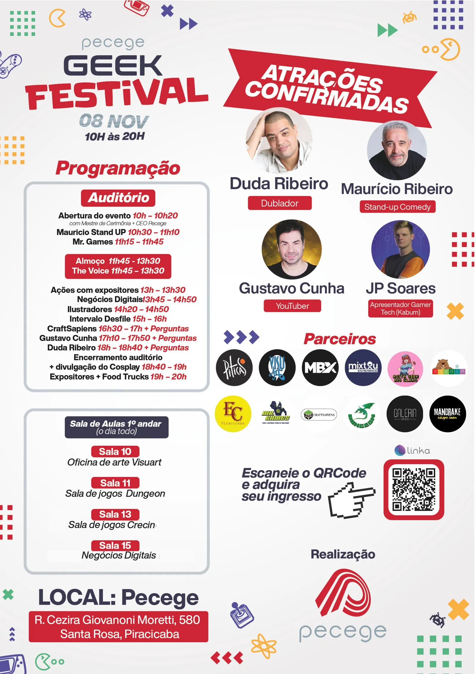 O Pecege Geek Festival 2025 acontecerá no dia 8 de novembro, no Pecege, das 10hs às 20hs, na Avenida Cezira Giovanoni Moretti, 580 – Loteamento Santa Rosa, Piracicaba, São Paulo.