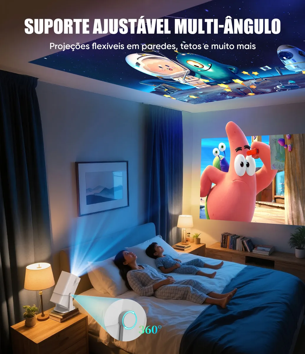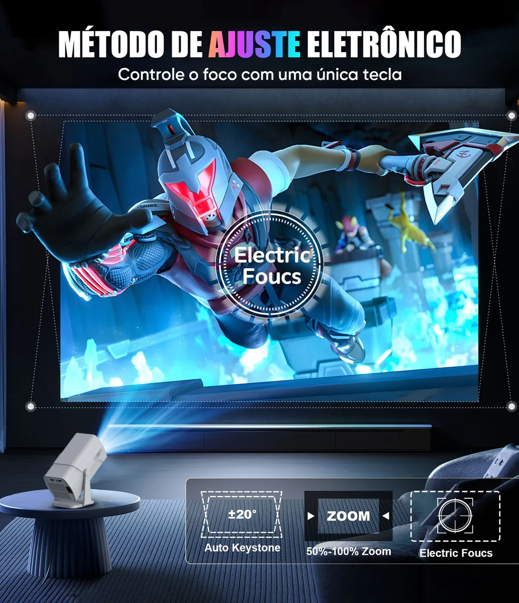 Além disso, há sistema de foco automático (mas pode ser ajustado caso queira) e ajuste de multi-ângulo para projetarmos em paredes, tetos e outros lugares, sem ficar tudo torto.