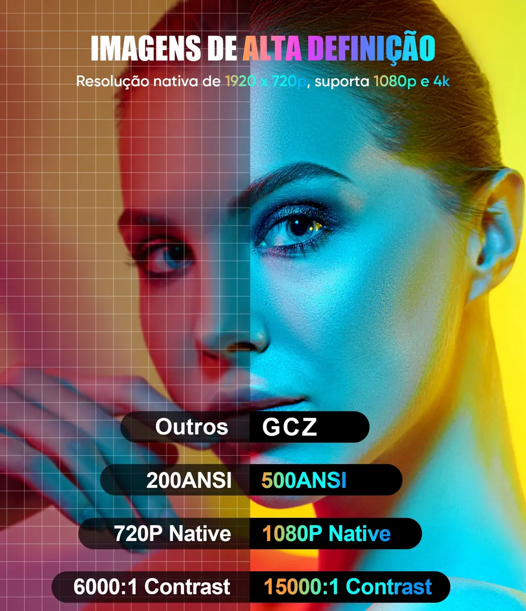 Apesar da GCZ informar que a qualidade de imagem pode chegar até 4K, temos que ressaltar que vários fatores tem que estar presentes para isto ser real. A primeira é de que não se amplie demais a imagem (quanto menor a projeção, melhor a qualidade), outra questão é se o vídeo que está vendo tem esta qualidade, além disso, utilize a tela de projeção que vem no kit para ter mais nitidez.