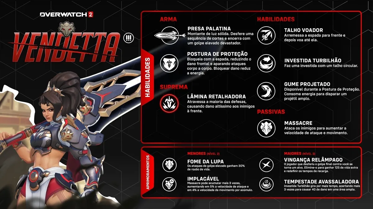 Uma nova e vilanesca heroína DPS chega hoje (9) ao Overwatch 2 acompanhada por uma enorme tempestade de conteúdo invernal. Vendetta é a primeira heroína DPS corpo a corpo da história do Overwatch! Ela chega empunhando uma ambição tão fria quanto gelo, com o legado da Talon em suas costas. Vendetta brilha quando a luta fica mais intensa. Ela avança, corta, salta e encurta a distância com um estilo quase régio (se os reis ainda resolvessem seus problemas com aço).