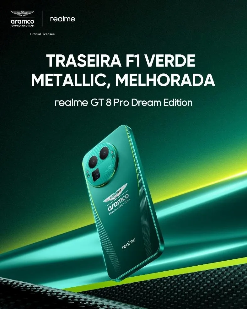 realme anunciou oficialmente o segundo smartphone co-criado com a Aston Martin Aramco F1 Team, o realme GT 8 Pro Dream Edition, que chega para ser o smartphone definitivo para os amantes de F1, combinando estética automobilística com espírito competitivo e desempenho inigualável.