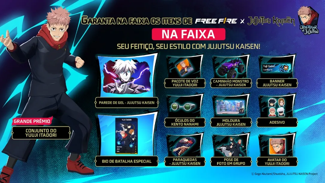 O evento irá mergulhar os jogadores no espírito de energia, crescimento e transformação da série por meio de uma jogabilidade intensa, arte e design de som. Os jogadores podem coletar “Energia Amaldiçoada” e desbloquear poderosos Jujutsus em um mundo de Free Fire reimaginado. A colaboração também contará com a versão Free Fire da Escola de Jujutsu do anime, juntamente com conjuntos de personagens com dublagens originais e visuais dinâmicos.