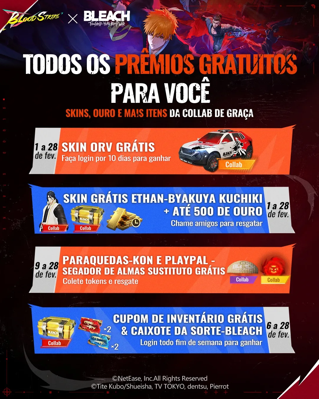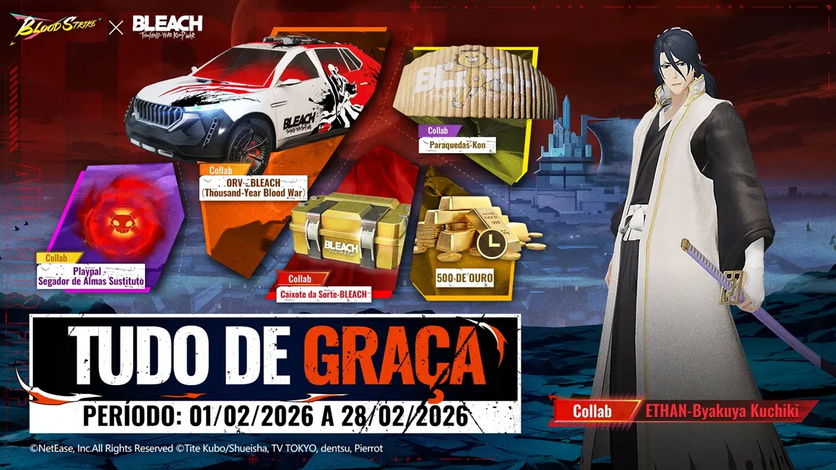 Com personagens emblemáticos como Ichigo Kurosaki, Rukia Kuchiki, Toshiro Hitsugaya e Byakuya Kuchiki, esta colaboração oferece uma mistura surpreendente do espírito de BLEACH: Thousand-Year Blood War e do combate de alta intensidade de Blood Strike. Uma experiência imperdível para os fãs de ambos os mundos.