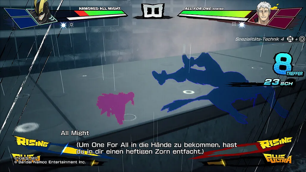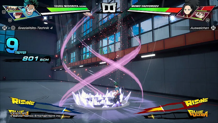 Após algum tempo, a barra de Rising é preenchida e você pode ativar utilizando o L3 + R3, fazendo assim seu personagem ganhar mais força por alguns instantes, e quem sabe depois preencher a barra de Plus Ultra e utilizando o R1 + círculo dar aquele super golpe no inimigo e ver a barra de energia dele se esvaziar.