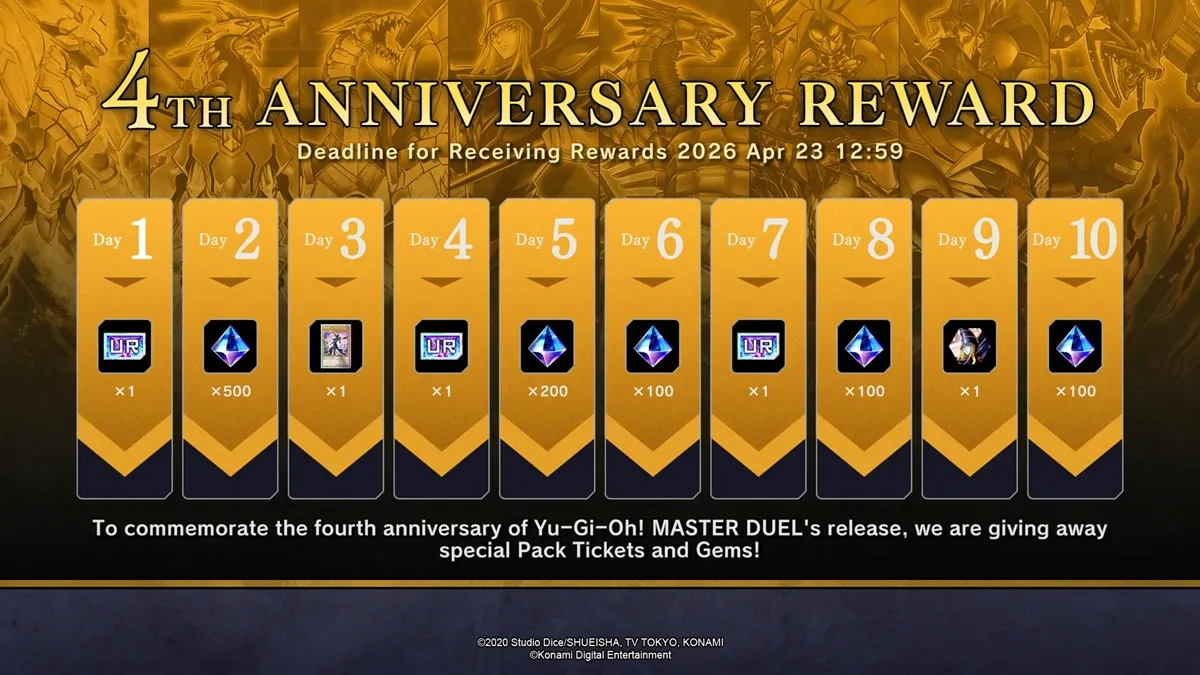 A Campanha do 4º Aniversário acontecerá de 5 de fevereiro a 8 de abril (as recompensas poderão ser obtidas até 22 de abril para os bônus de login). Para mais informações sobre Yu-Gi-Oh! MASTER DUEL, visite o site oficial.