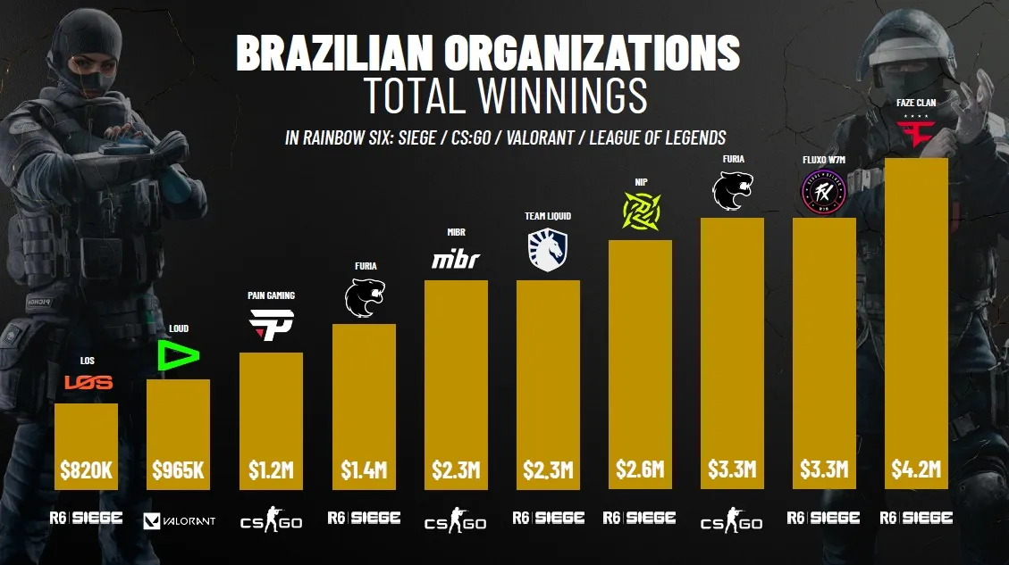 A relevância de R6S também se reflete no desempenho das organizações brasileiras. Entre as cinco equipes nacionais com maiores premiações acumuladas nos esports, quatro competem em Rainbow Six: Siege: FaZe Clan (1º — US$ 4,2 milhões), W7M Esports (2º — US$ 3,3 milhões), Ninjas in Pyjamas (4º — US$ 2,6 milhões) e Team Liquid (5º — US$ 2,3 milhões). Apenas a FURIA, com equipes de Counter-Strike, aparece fora da modalidade, ocupando a terceira posição.