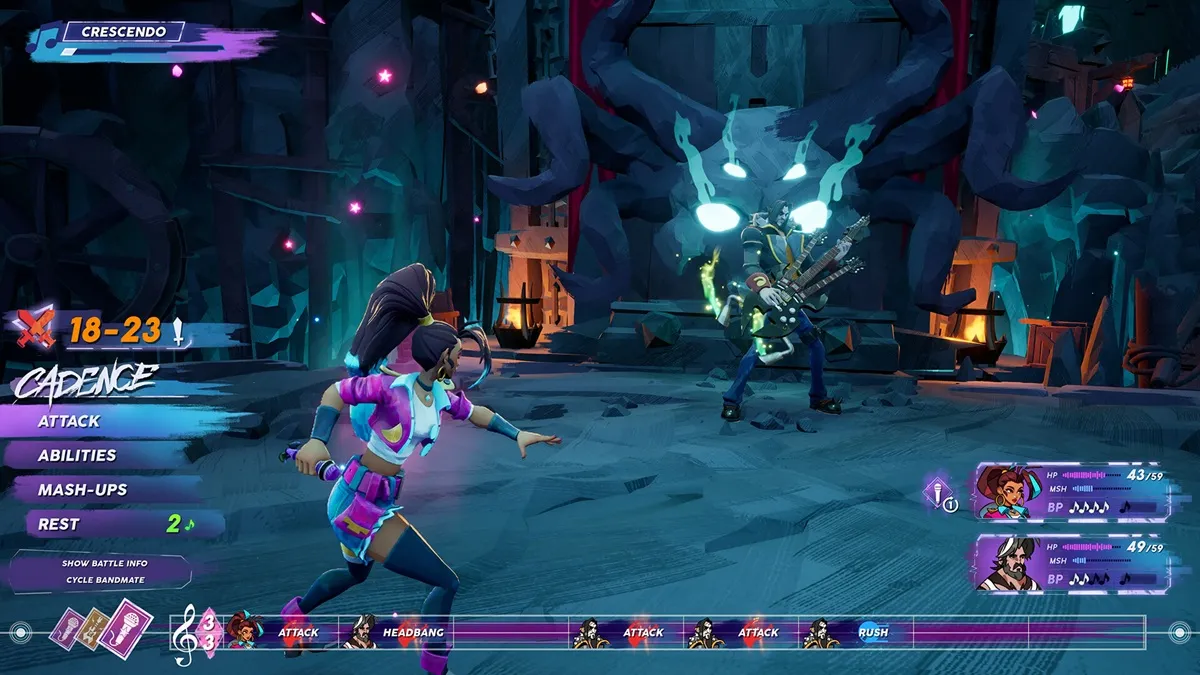 A grande sacada de People of Note está no seu sistema de batalha. Aqui, o combate tradicional por turnos ganha uma camada rítmica que dita o fluxo das ações.